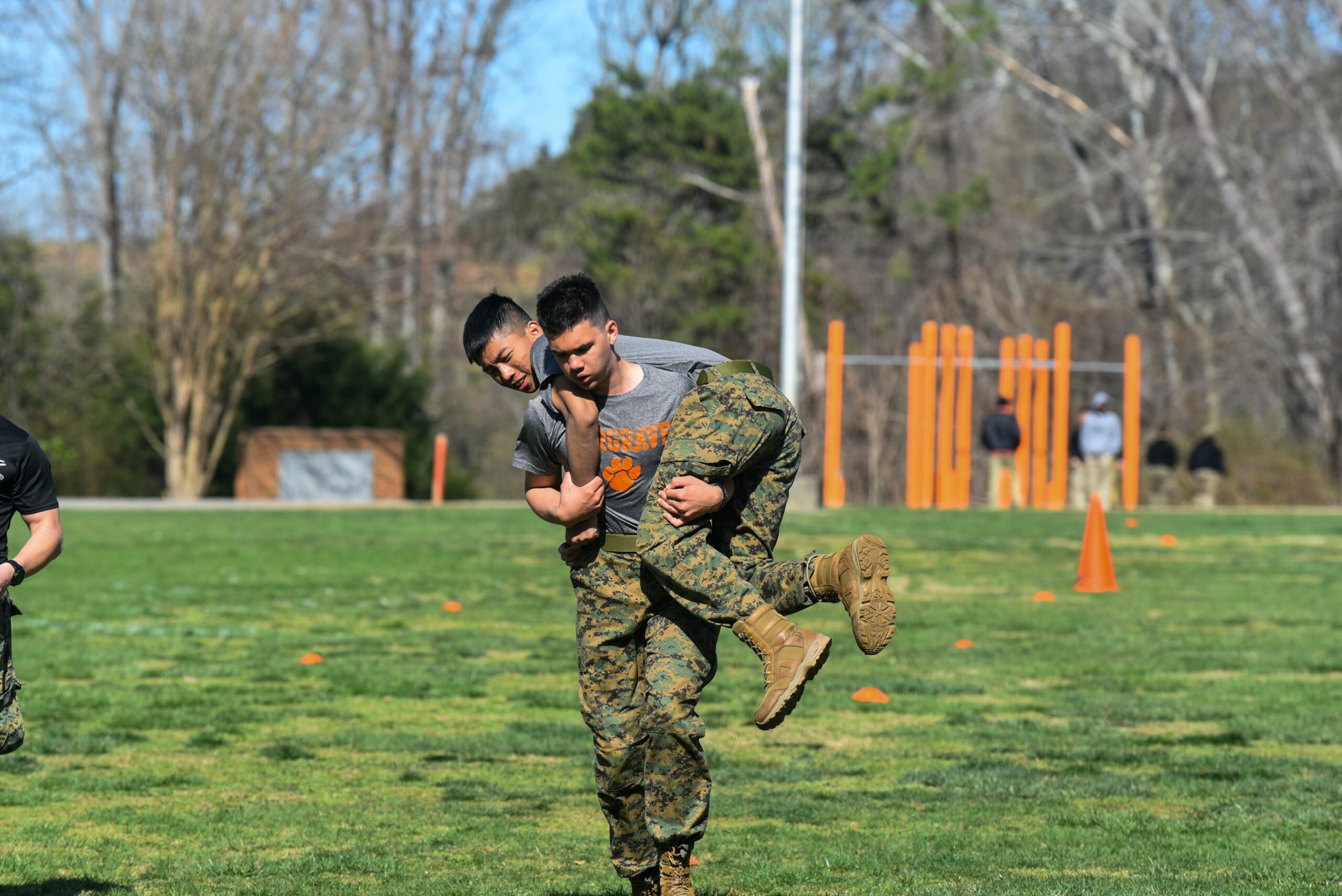 At 0600 on Saturday, 2 April 2022, thirty-six Cadets reported to the track to begin the Eye of the Tiger (EoT) Challenge. The first event of EoT was the Physical Fitness Test consisting of a timed 1-mile run, a max set of pushups in 2 minutes, and a max set of crunches in 2 minutes. After a quick change into their camouflage uniform, the Cadets ate a quick breakfast before they reported back out to the track to complete the next event, the Combat Fitness Test. The Combat Fitness Test required each of the participants to complete a timed 880-meter sprint, 2-minute 30-pound ammo can military press, and a course called the “maneuver under fire” which consists of low crawling, high crawling, a buddy drag, a fireman’s carry, and sprint with two 30-pound ammo cans. Most Cadets were already tired at this point, and we had just begun the 27-hour long challenge.