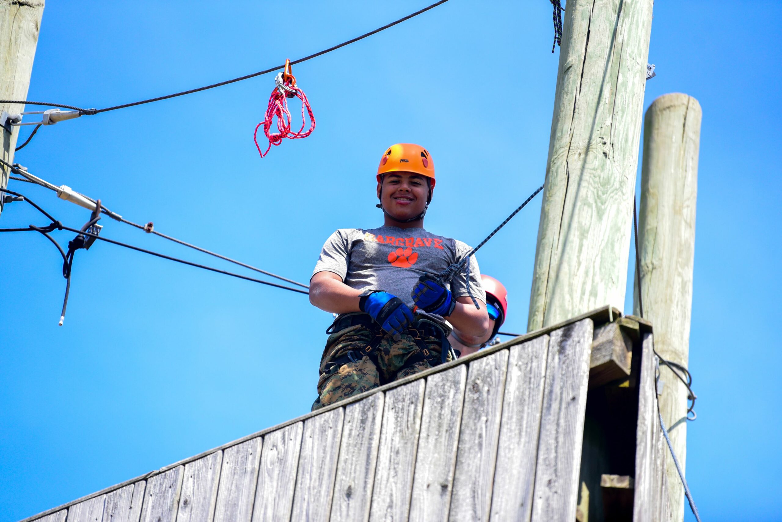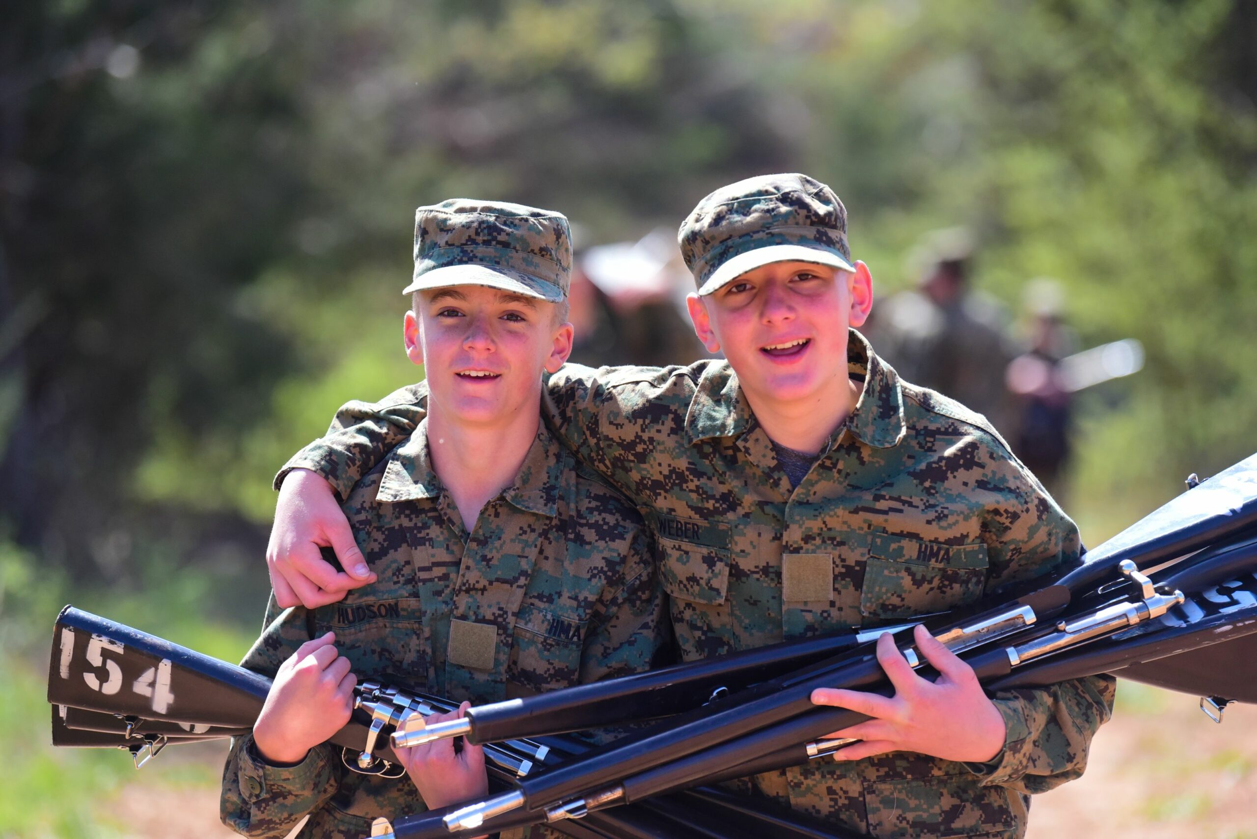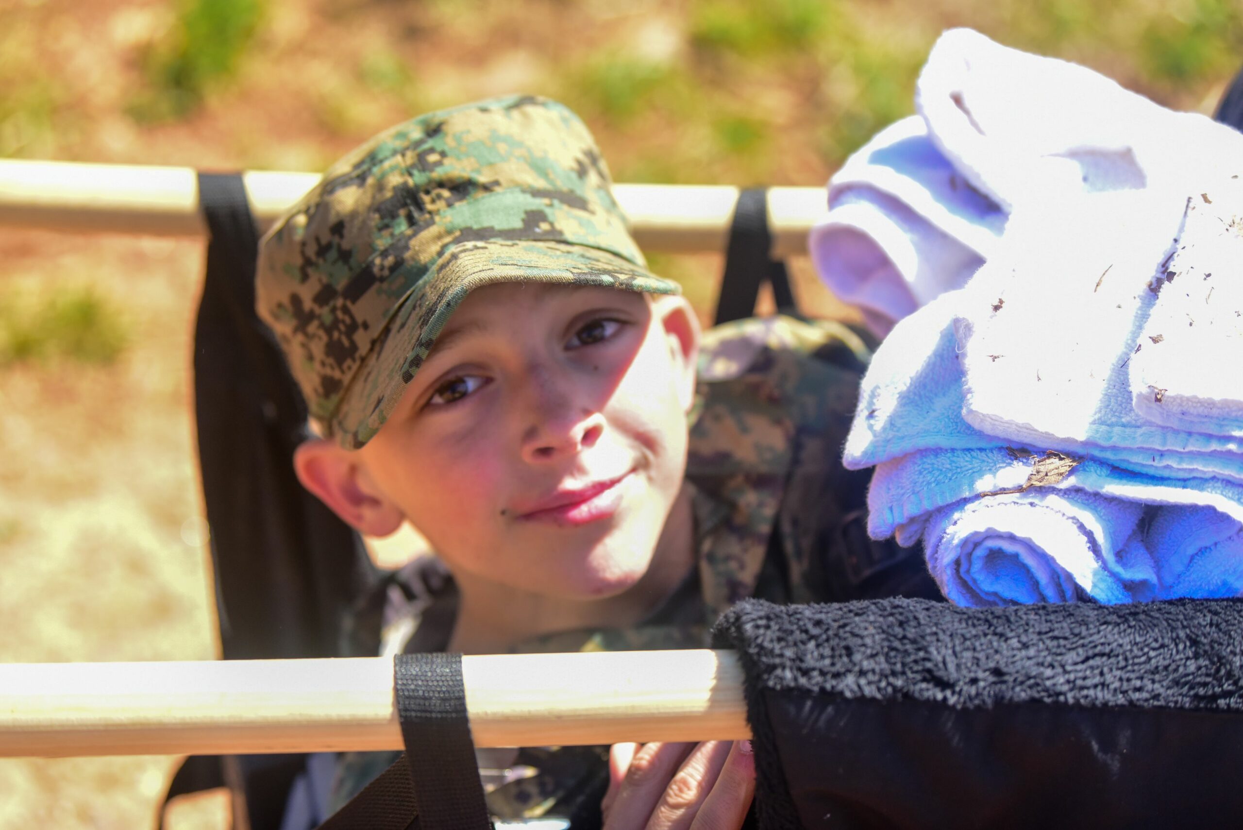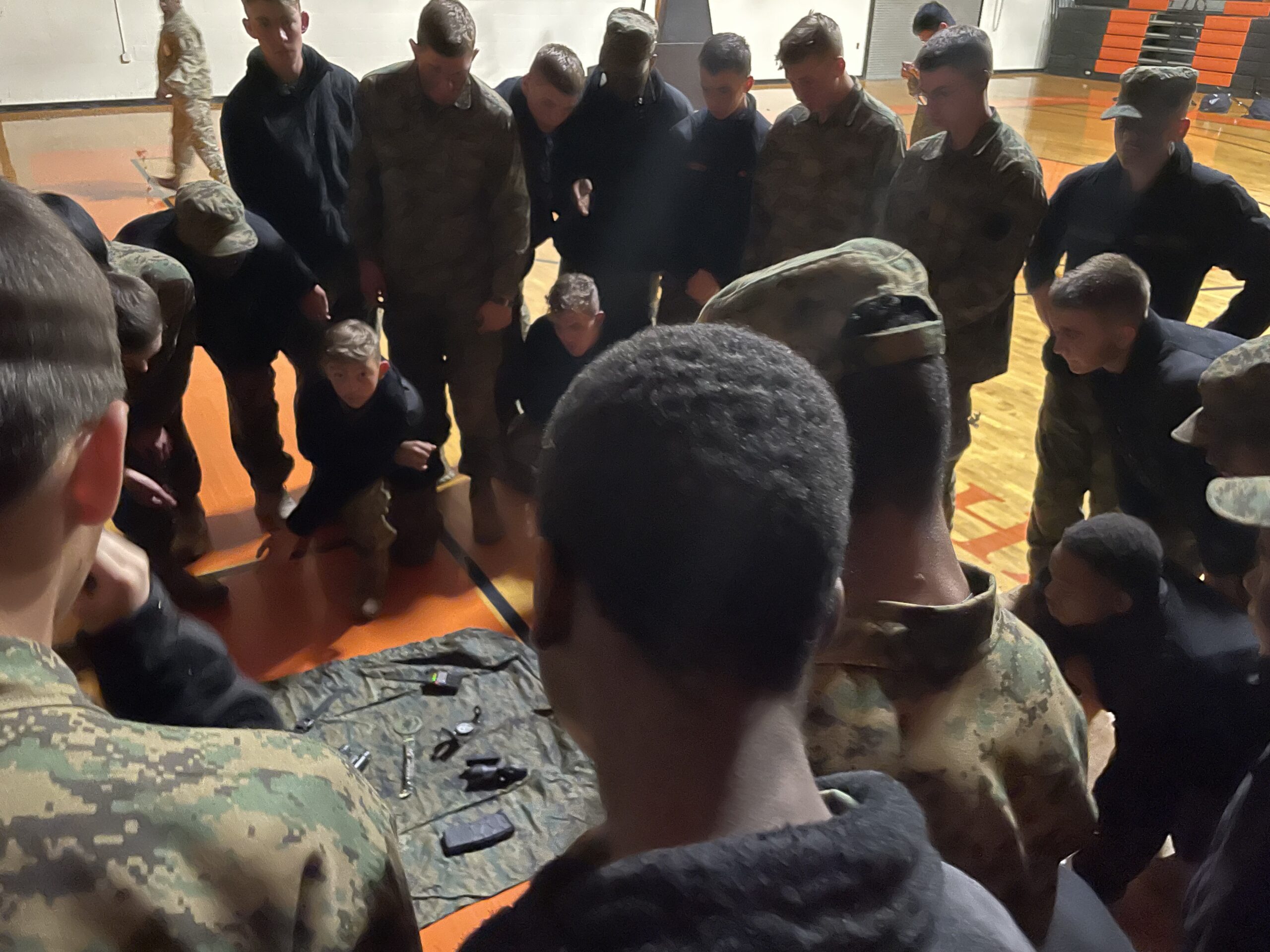 Next up was a timed run through the obstacle course to include a penalty for each obstacle that they did not complete successfully. Then came the wall climb and rappelling event which required the Cadets to scale the climbing tower and then rappel down within a time limit. And then came lunch in the field, where Cadets were able to catch their breath for a few moments before they were tested on their first aid skills.  During the life-saving portion of the EoT, Cadets were presented with a scenario of an injured person which they had to bandage, splint, and/or place a tourniquet on using the training they had received in the weeks leading up to EoT.